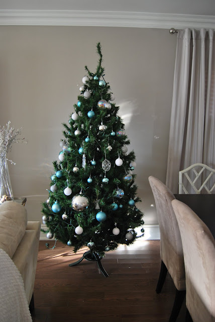 Yes I have already started decorating for Christmas and although I still have a lot to do, here is just a little sneak of what I have done so far. I have decided on ice blues, silver and whites this year because of the decor in my home which is largely neutral and pale blue. I did have some left over gold balls from last year so I decided to use them around the house for extra decor. Hope you all enjoy!